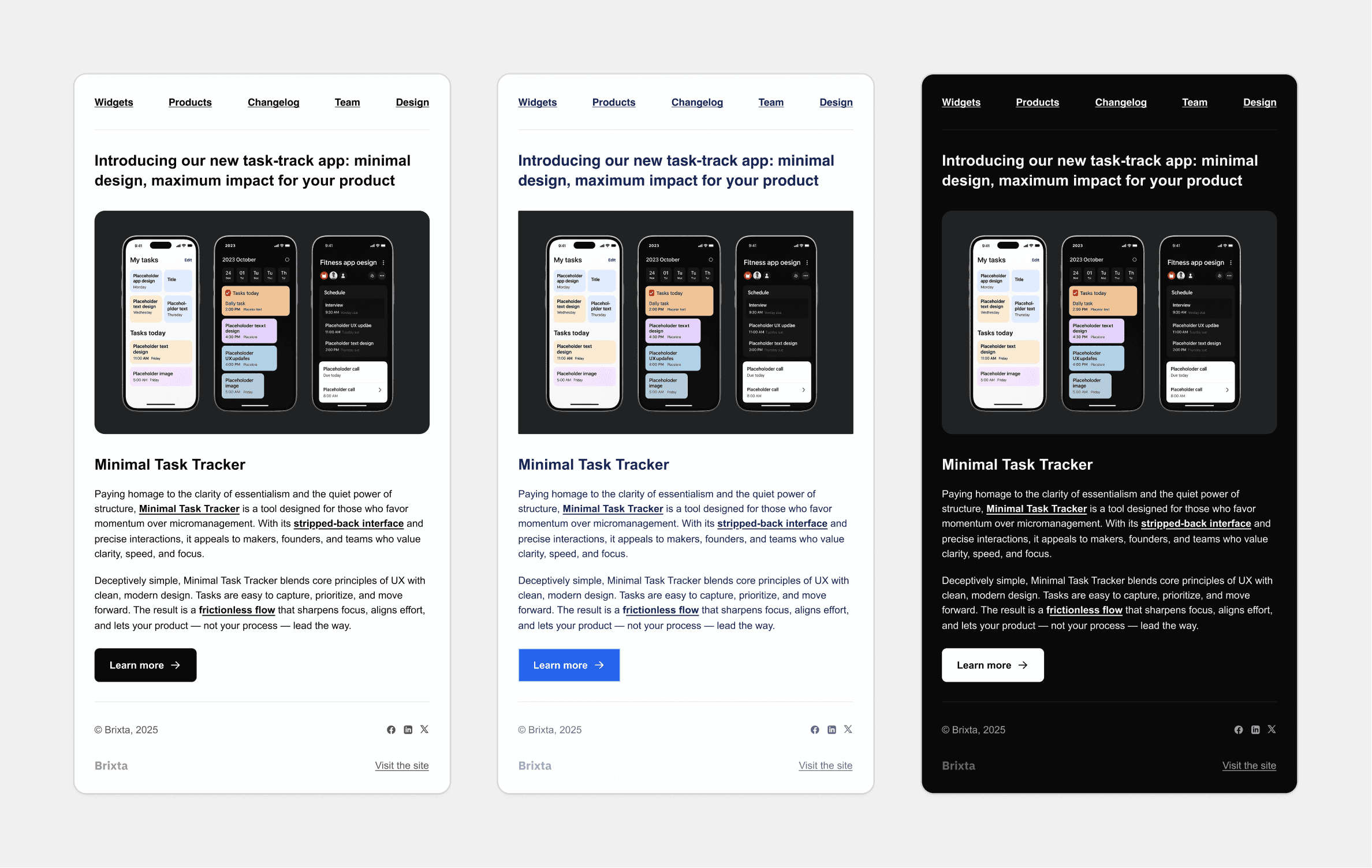Brixta Mails is a modular UI kit for building modern responsive email interfaces. It includes clean, production-ready components and templates — available as copy-paste code snippets and Figma design assets — that you can drop into your product or email service provider and fully customize. Built with flexible theming, clarity, and compatibility in mind, so you can ship faster and own the final result.